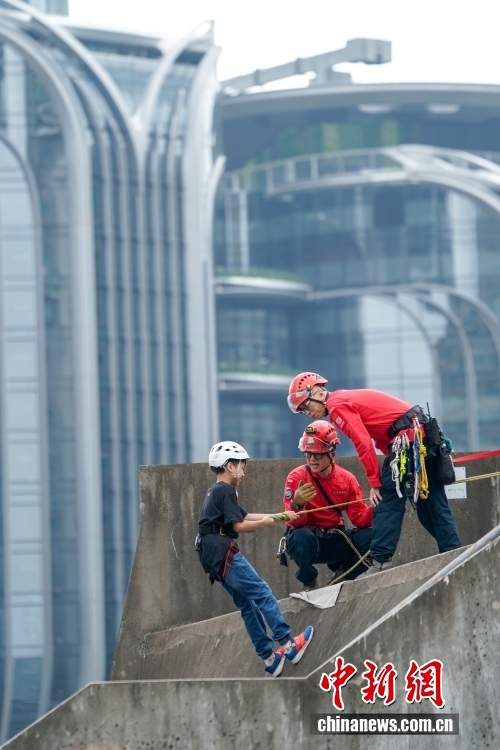 4月11日,今年“全民国家安全教育日”到来前夕,香港民众安全服务队(简称“民安队”)总部举行开放日活动,香港市民通过参与虚拟实境救援、摊位游戏、搜救器材展示等互动体验活动,加深对民安队的认识,增强维护国家安全意识。图为一名小朋友体验斜坡下降搜救项目。