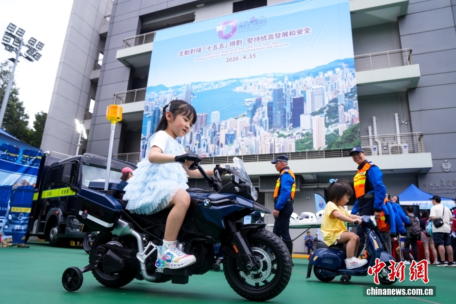 4月11日,今年“全民国家安全教育日”到来前夕,香港民众安全服务队(简称“民安队”)总部举行开放日活动,香港市民通过参与虚拟实境救援、摊位游戏、搜救器材展示等互动体验活动,加深对民安队的认识,增强维护国家安全意识。图为小朋友体验民安队的摩托车模型。