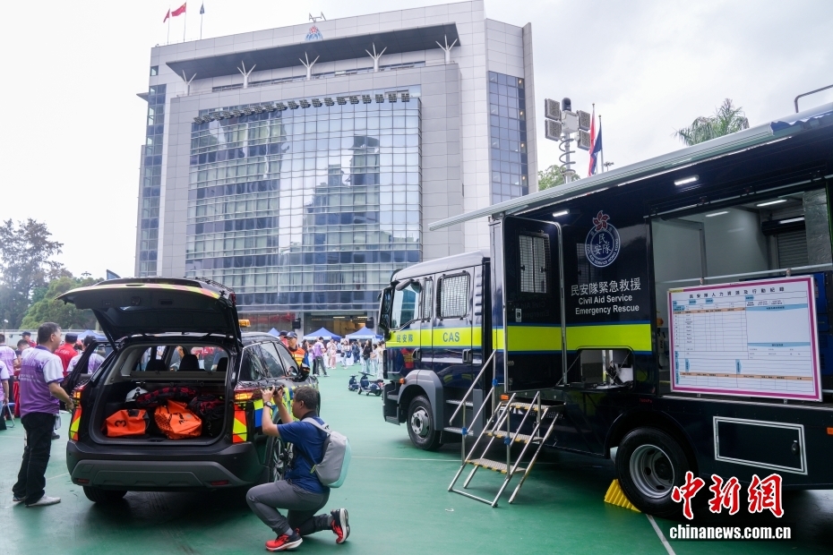 4月11日,今年“全民国家安全教育日”到来前夕,香港民众安全服务队(简称“民安队”)总部举行开放日活动,香港市民通过参与虚拟实境救援、摊位游戏、搜救器材展示等互动体验活动,加深对民安队的认识,增强维护国家安全意识。图为市民参观民安队紧急救援车辆。