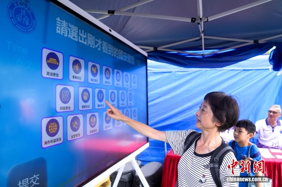 4月11日,今年“全民国家安全教育日”到来前夕,香港民众安全服务队(简称“民安队”)总部举行开放日活动,香港市民通过参与虚拟实境救援、摊位游戏、搜救器材展示等互动体验活动,加深对民安队的认识,增强维护国家安全意识。图为一位市民参加摊位游戏,了解国家安全知识。