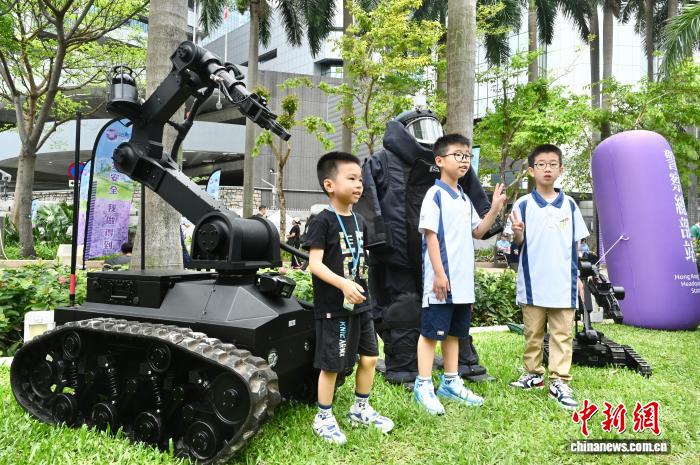 图为三名男孩在香港警方爆炸品处理课展示的设备前合影。中新网记者 李志华 摄