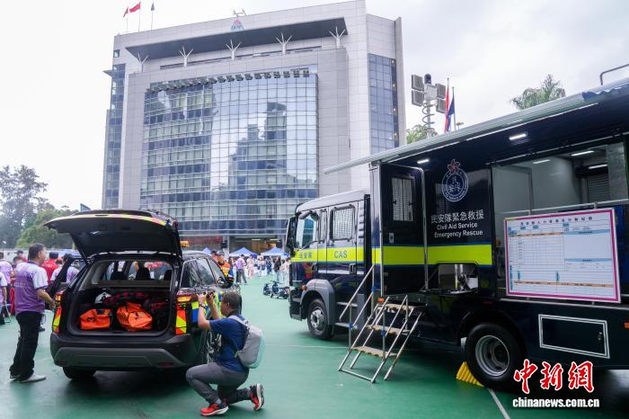 4月11日,今年“全民国家安全教育日”到来前夕,香港民众安全服务队总部举行开放日活动。图为市民参观紧急救援车辆。 中新社记者 张祥毅 摄