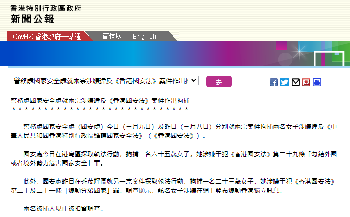 【环球网报道】香港特区政府3月9日深夜发布新闻公报称,香港警务处国家安全处(国安处)8日及9日分别就两宗案件拘捕两名女子,两人涉嫌违反香港国安法,正被扣留调查。