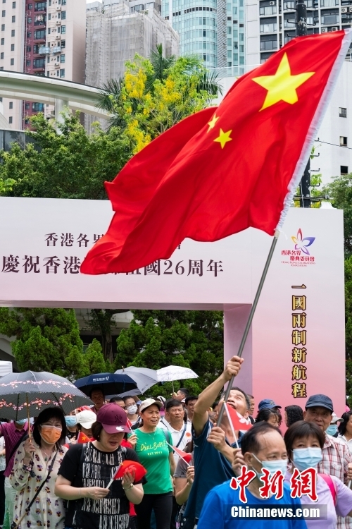 6月30日,香港各界庆典委员会“庆祝香港回归祖国26周年”系列活动在维多利亚公园开启。图为入园参观的市民团体挥舞国旗。