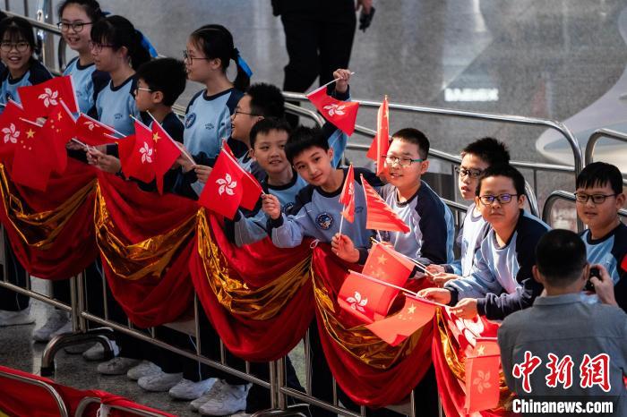 11月28日,载人航天工程代表团抵达香港,开启对香港特区为期四天的访问。代表团在香港国际机场到达大厅受到香港青少年等的热烈欢迎。图为青少年手持国旗和区旗等待代表团抵达。 中新网记者 侯宇 摄
