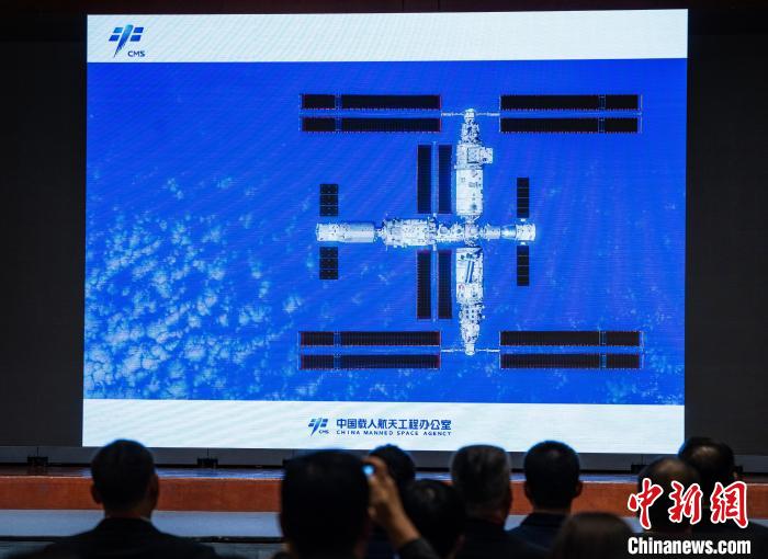 11月28日,载人航天工程代表团在香港会展中心举行媒体见面会,代表团团长、中国载人航天工程办公室副主任林西强在见面会上首次发布中国空间站组合体全景照片,这是中国首次在轨获取以地球为背景的空间站组合体全貌图像。 中新网记者 侯宇 摄