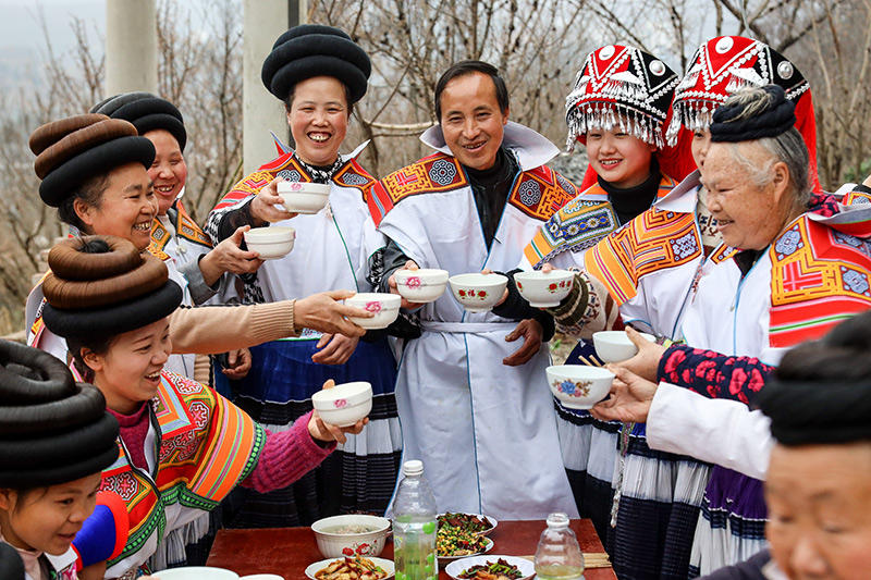在位于乌蒙山区腹地的贵州省毕节市纳雍县,苗族村民马雍(右五)与妻子黄国琴(左五)在年夜饭上与大家干杯(2021年2月11日摄)。新华社记者 欧东衢 摄