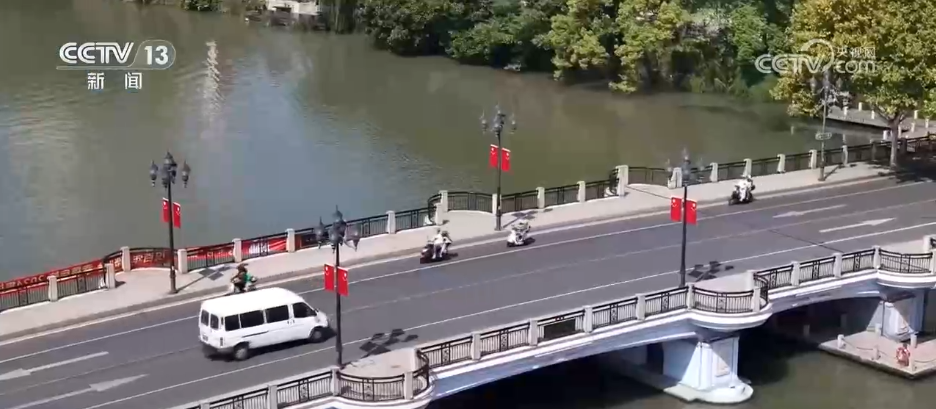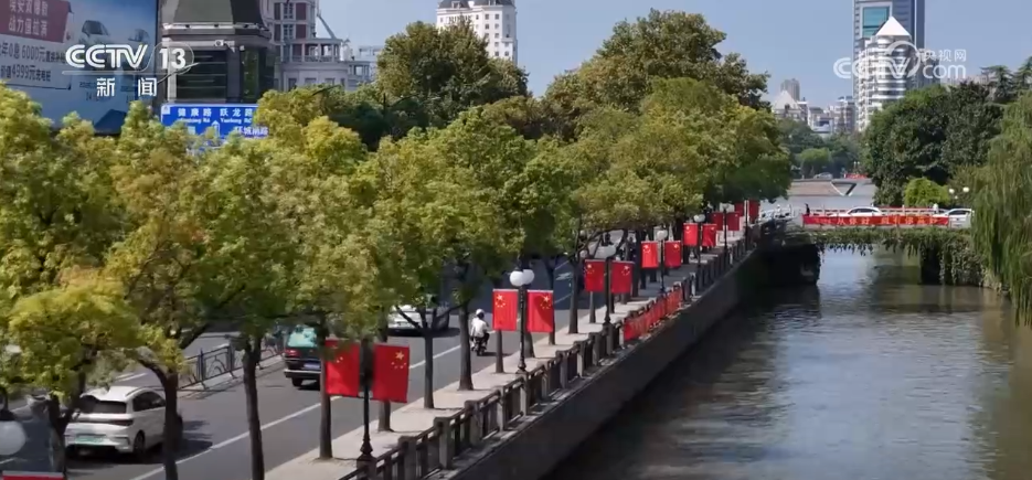 同样,这几天,江苏多地也在打造浓浓的节日氛围。在南通濠河边,鲜艳的国旗像一簇簇跳动的火焰,与濠河的粼粼波光、两岸的绿树葱茏交相辉映,构成了一幅流动的中国红画卷。