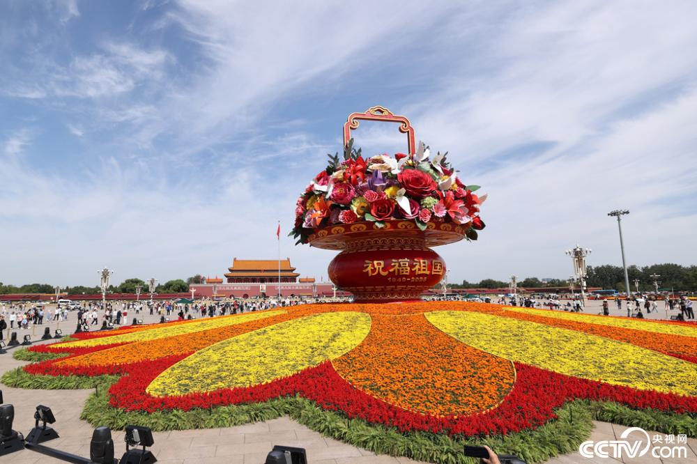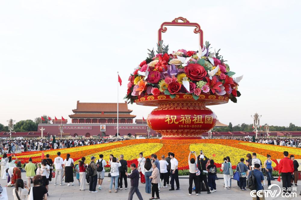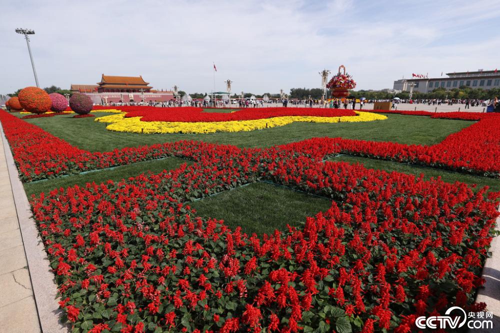 北京天安门广场装扮一新,花团锦簇盛装迎国庆,充满浓浓的节日喜庆氛围,吸引众多游人前来参观游览。 视觉中国