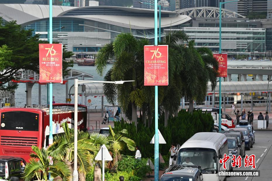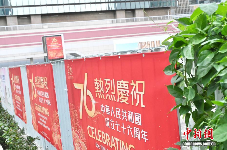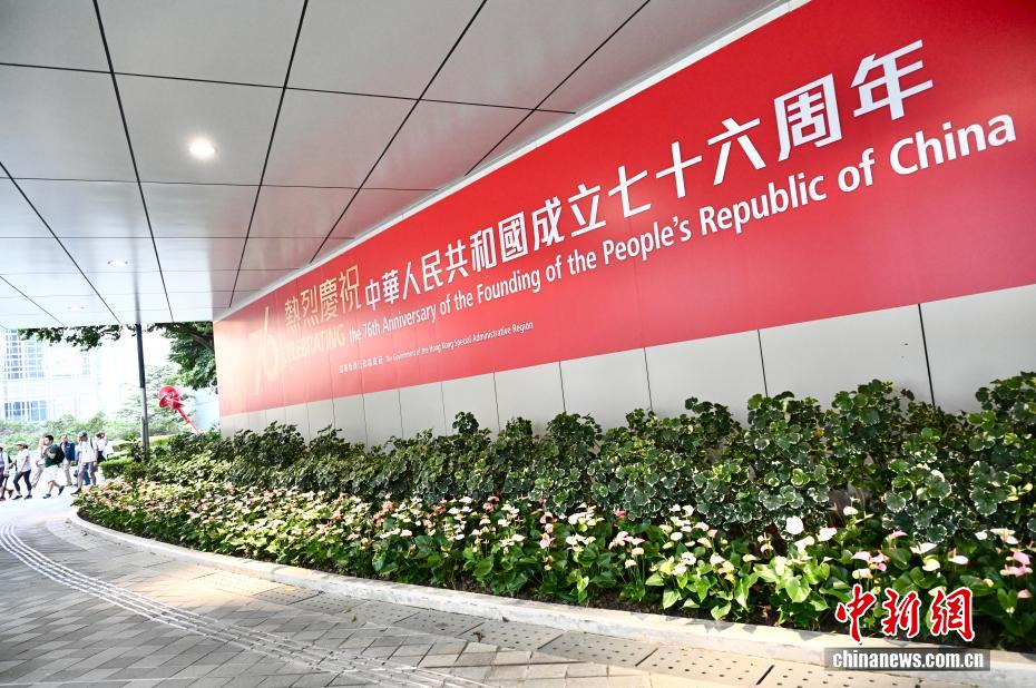 国庆节临近,9月25日,香港街头迎国庆气氛浓厚。图为香港特区政府总部外墙张贴的庆祝标语。