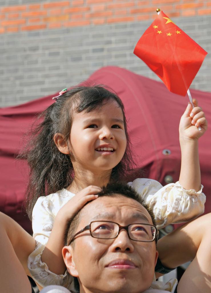 10月1日,在河北省石家庄解放广场,小朋友在家长陪伴下参加升旗仪式。