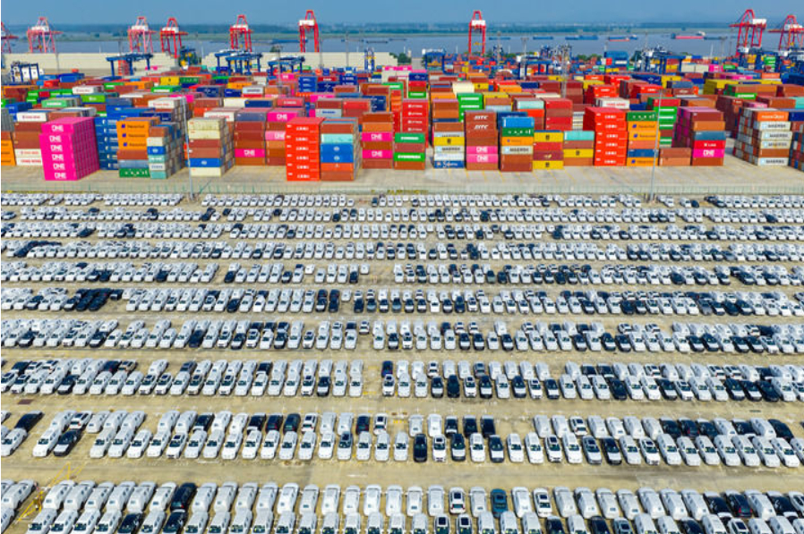 2025年10月4日在江苏省港口集团南京港龙潭港区拍摄的准备装船出口的汽车(无人机照片)。新华社发(杨素平摄)
