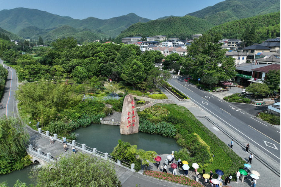 2023年8月11日,游客在浙江安吉余村参观(无人机照片)。新华社记者 翁忻旸 摄