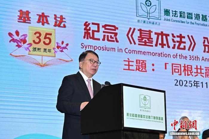 中新社香港11月1日电 “纪念《基本法》颁布三十五周年研讨会”1日在香港举行。香港特区署理行政长官陈国基在研讨会致辞时表示,宪法与香港基本法共同构成香港特区的宪制秩序,令“一国两制”得以成功实践,并取得举世瞩目的成就。